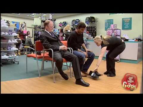 איש עסקים בנעלי עקבגבר לבוש בחליפה מודד נעלי עקב בחנות נעליים. זה רק נהיה מצחיק יותר כשהוא מבקש עזרה בבחירה שבין הנעליים השחורות והאדומות.
